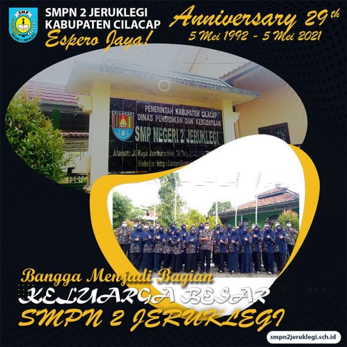 Dalam rangka memeriahkan HUT Ke-29 SMP Negeri 2 Jeruklegi pada tanggal 5 Mei 2021, Sekolah menyediakan twibbon. Silahkan bagi siswa-siswi, alumni, dan keluarga besar SMP Negeri 2 Jeruklegi bisa menggunakan twibbon berikut:
