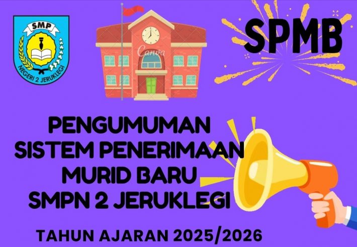 Pengumuman SPBM (Sistem Penerimaan Murid Baru) Tahun Ajaran 2025/2026 akan dilaksanakan pada hari Jumat, 13 Juni 2025 Pukul 09.00 WIB di SMP Negeri 2 Jeruklegi. Calon murid baru hadir dan membawa bukti pendaftaran SPMB.